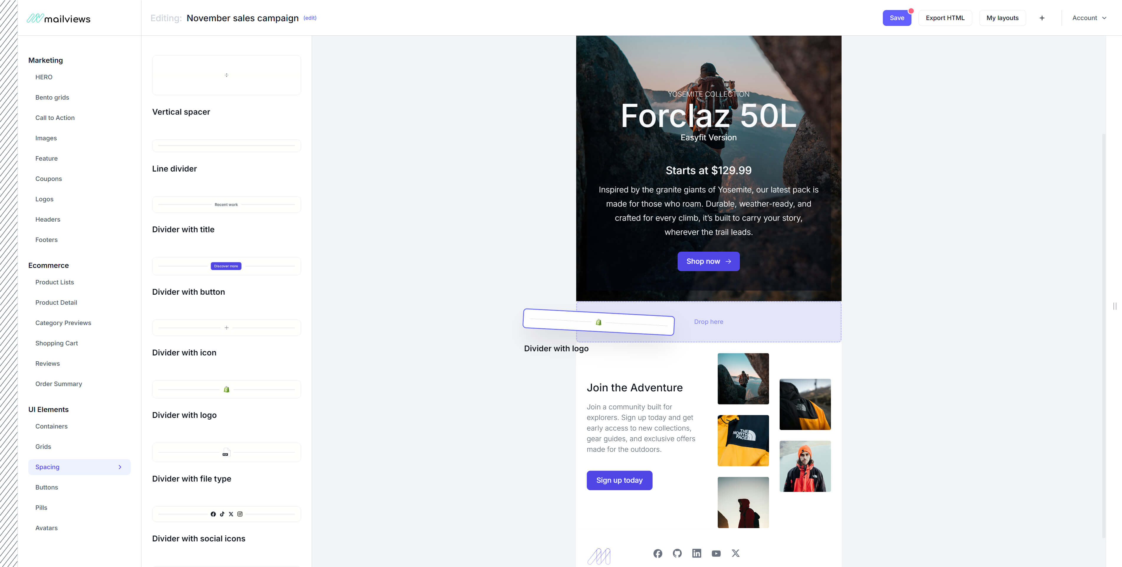 And then there’s the Builder, that helps you quickly stack components and export a layout that you can then download and edit text/images locally or in your email service provider.