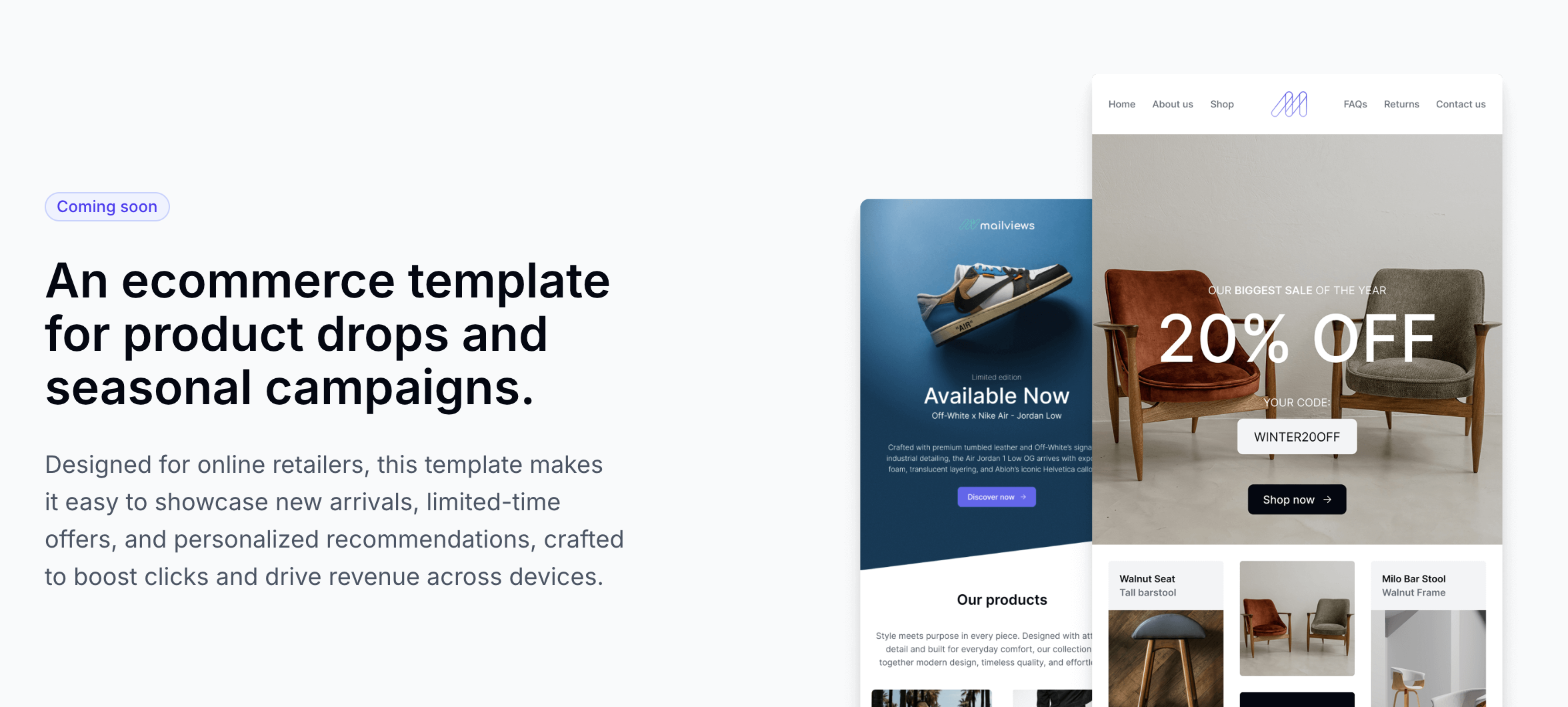 Mailviews Templates are kits that you download as .zip files, with various prebuilt layouts for specific industries. The first one is coming soon in early December, an ecommerce template for product drops and seasonal campaigns with more in the plans.