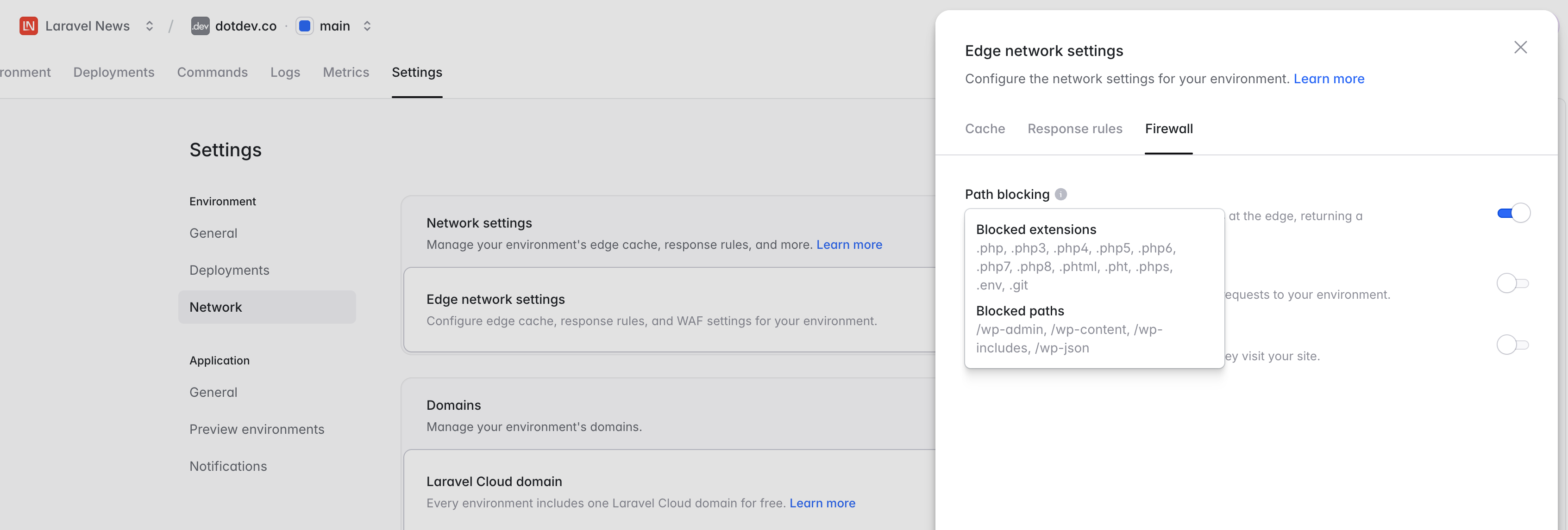 With Path Blocking enabled, Laravel Cloud can ignore those requests entirely so they do not trigger wakeups, events, or unnecessary activity.