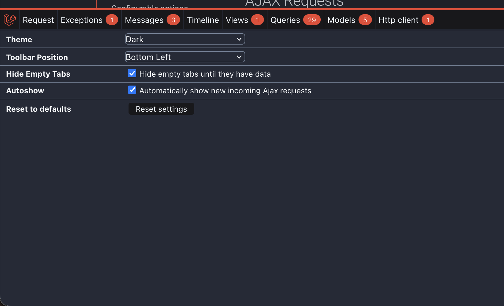 This version has many UI improvements and settings like debugbar position, auto-hiding empty collectors, themes (Dark, Light, Auto), and more:
