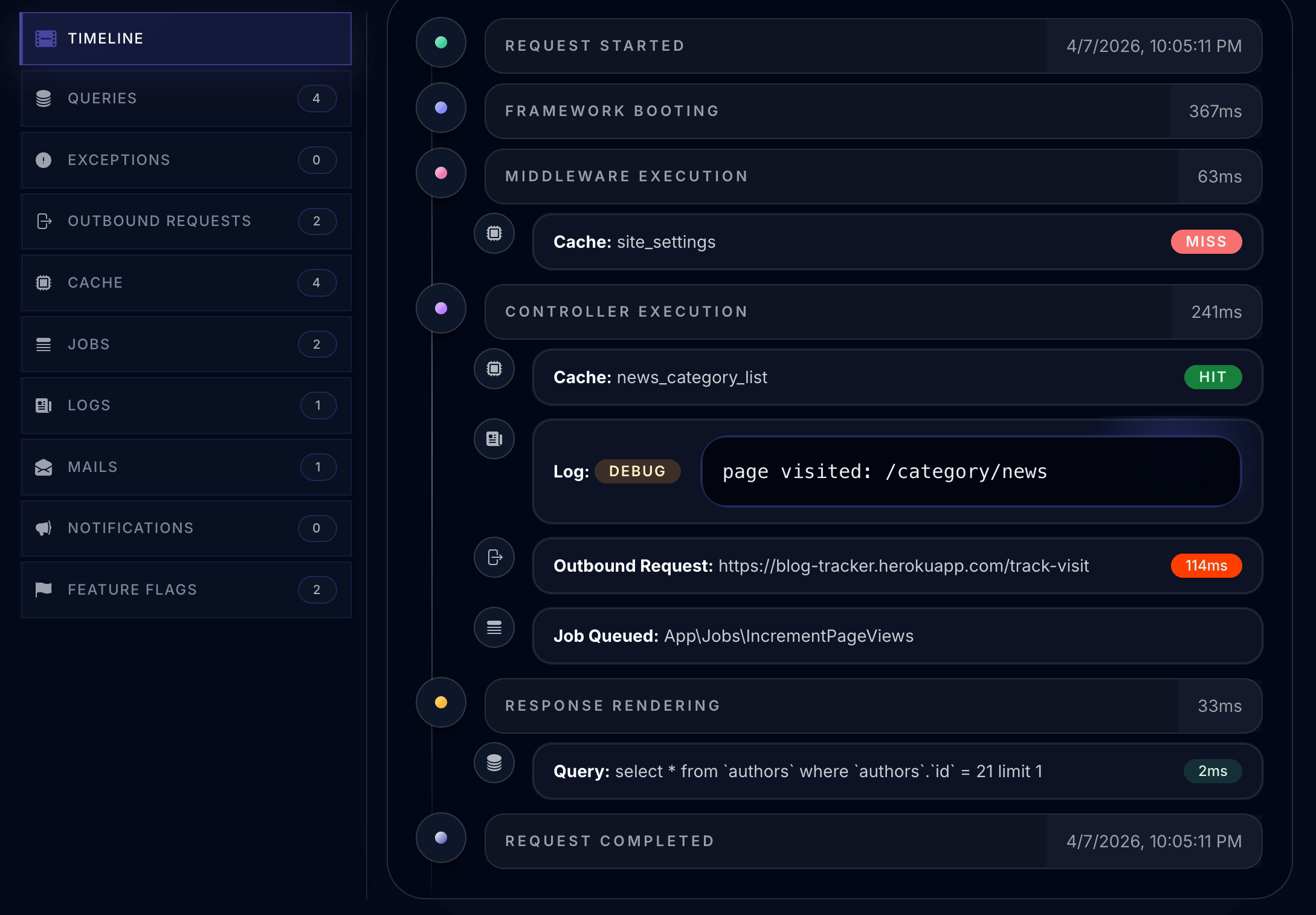 Laritor captures everything in a single timeline per request: every query with its execution time, every outbound HTTP call, every feature flag evaluation, every cache hit and miss. The bottleneck is usually obvious within 30 seconds.