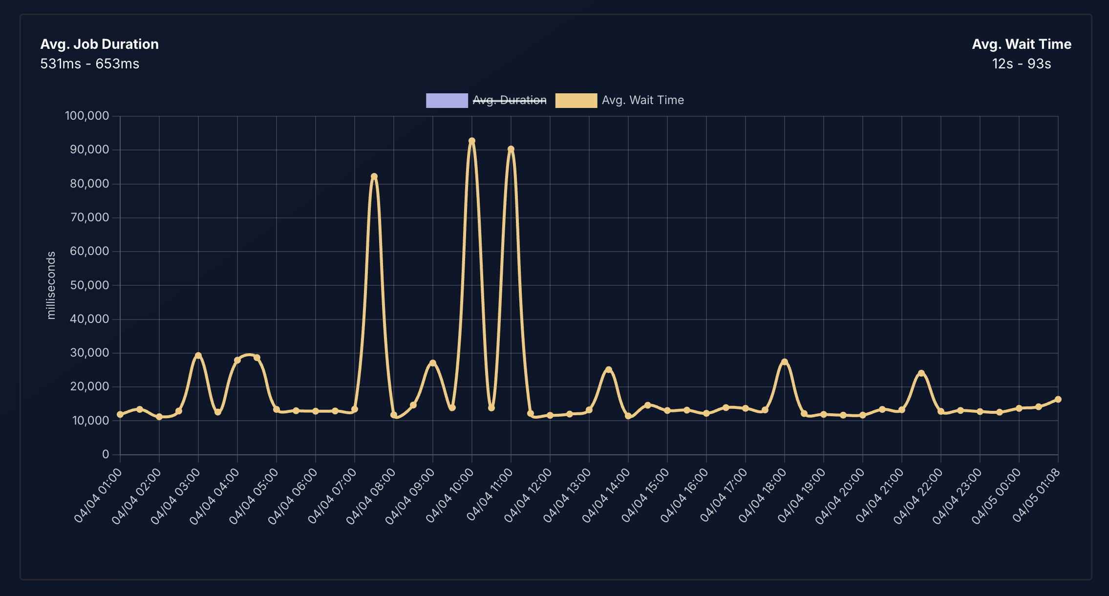 Most tools tell you when a job failed. Laritor shows you what your queue system is doing over time: jobs processed, failed, and pending, average wait time, and a line graph of dispatched volume so you can see exactly when a spike started and how long jobs are sitting before pickup. The kind of detail that answers "why were notifications delayed at 3pm on Tuesday" without guessing.