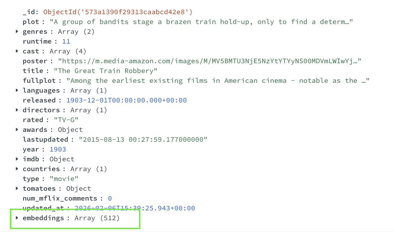 After using it, you can return to the MongoDB Atlas GUI and look at your documents. You should see a new "embedding" field, with an array of 512 floats. That is the vector embedding for that document. We now have documents that are ready to be indexed, well done!