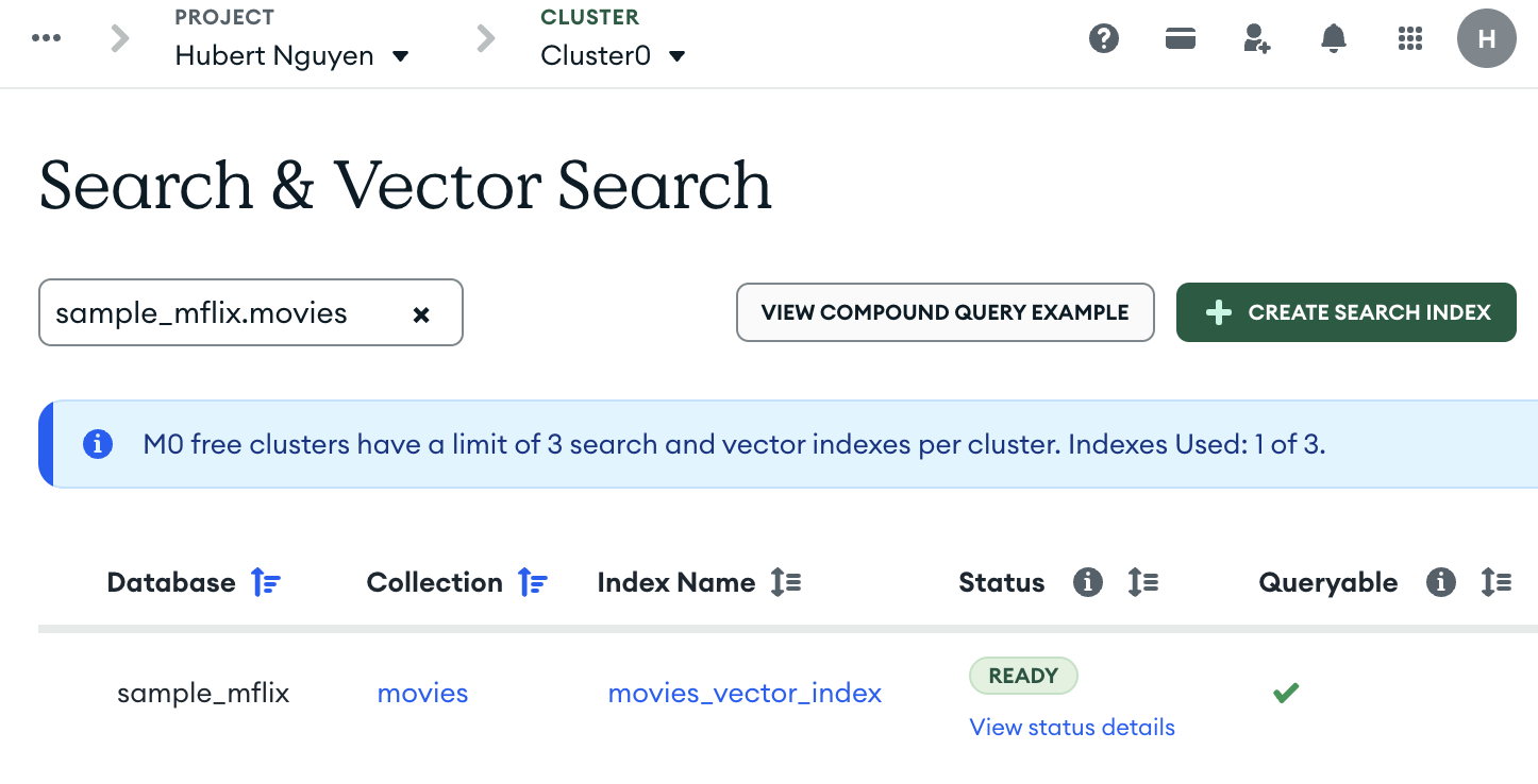 After that, you can check that the index has been created and is ready. In our code repo, the initial index build appears almost instantaneous because we have only 100 vector embeddings to index. However, a database with a few thousand vectors would take some seconds, and the index build time may scale linearly from there. We're suggesting using a free instance here, but there are ways to greatly scale in production, including with the dedicated Search Nodes.