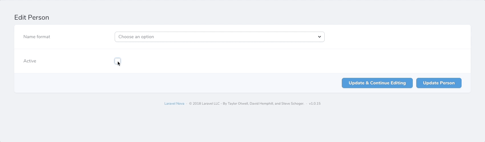 class Page extends Resource{ use HasDependencies; public function fields(Request $request) { return [ Select::make('Name format', 'name_format')->options([ 0 => 'First Name', 1 => 'First Name / Last Name', 2 => 'Full Name' ])->displayUsingLabels(), NovaDependencyContainer::make([ Text::make('First Name', 'first_name') ])->dependsOn('name_format', 0), ]; }}