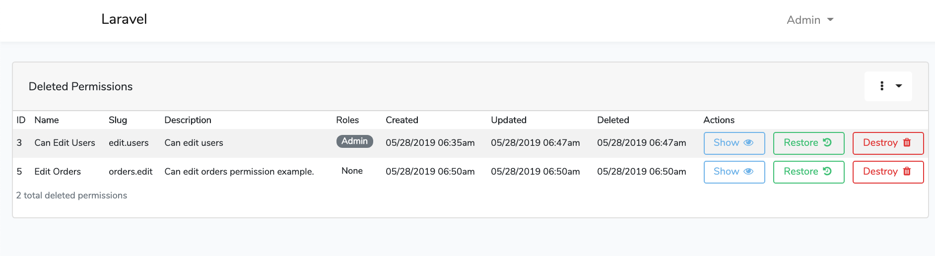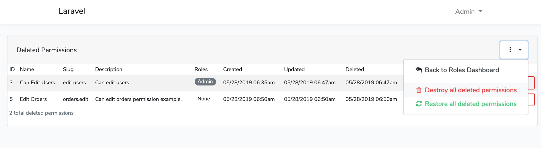 $createUsersPermission = config('roles.models.permission')::create([ 'name' => 'Create users', 'slug' => 'create.users', 'description' => '', // optional]); $deleteUsersPermission = config('roles.models.permission')::create([ 'name' => 'Delete users', 'slug' => 'delete.users',]);