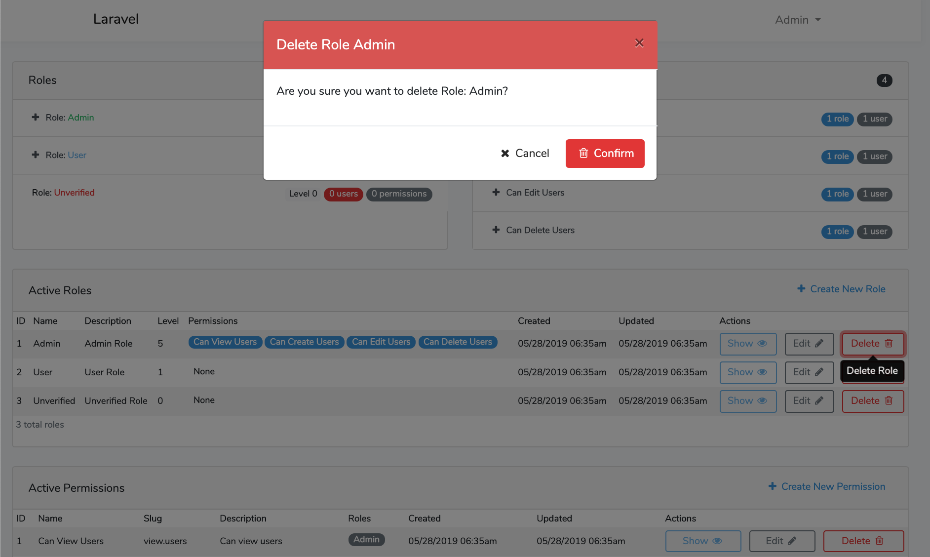 This package comes with VerifyRole, VerifyPermission and VerifyLevel middleware.