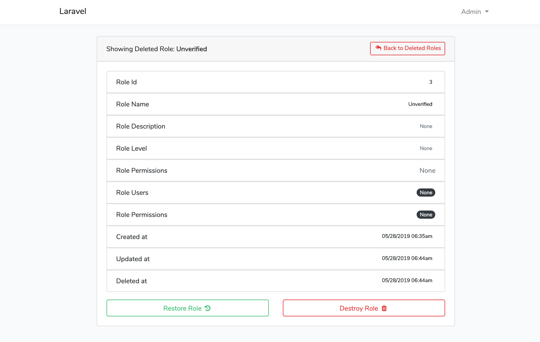 +--------+-----------+---------------------------------+-----------------------------------------------+-----------------------------------------------------------------------------------------------------------------+---------------------+| Domain | Method | URI | Name | Action | Middleware |+--------+-----------+---------------------------------+-----------------------------------------------+-----------------------------------------------------------------------------------------------------------------+---------------------+| | GET|HEAD | permission-deleted/{id} | laravelroles::permission-show-deleted | jeremykenedy\LaravelRoles\App\Http\Controllers\LaravelpermissionsDeletedController@show | web,auth,role:admin || | DELETE | permission-destroy/{id} | laravelroles::permission-item-destroy | jeremykenedy\LaravelRoles\App\Http\Controllers\LaravelpermissionsDeletedController@destroy | web,auth,role:admin || | PUT | permission-restore/{id} | laravelroles::permission-restore | jeremykenedy\LaravelRoles\App\Http\Controllers\LaravelpermissionsDeletedController@restorePermission | web,auth,role:admin || | POST | permissions | laravelroles::permissions.store | jeremykenedy\LaravelRoles\App\Http\Controllers\LaravelPermissionsController@store | web,auth,role:admin || | GET|HEAD | permissions | laravelroles::permissions.index | jeremykenedy\LaravelRoles\App\Http\Controllers\LaravelPermissionsController@index | web,auth,role:admin || | GET|HEAD | permissions-deleted | laravelroles::permissions-deleted | jeremykenedy\LaravelRoles\App\Http\Controllers\LaravelpermissionsDeletedController@index | web,auth,role:admin || | DELETE | permissions-deleted-destroy-all | laravelroles::destroy-all-deleted-permissions | jeremykenedy\LaravelRoles\App\Http\Controllers\LaravelpermissionsDeletedController@destroyAllDeletedPermissions | web,auth,role:admin || | POST | permissions-deleted-restore-all | laravelroles::permissions-deleted-restore-all | jeremykenedy\LaravelRoles\App\Http\Controllers\LaravelpermissionsDeletedController@restoreAllDeletedPermissions | web,auth,role:admin || | GET|HEAD | permissions/create | laravelroles::permissions.create | jeremykenedy\LaravelRoles\App\Http\Controllers\LaravelPermissionsController@create | web,auth,role:admin || | PUT|PATCH | permissions/{permission} | laravelroles::permissions.update | jeremykenedy\LaravelRoles\App\Http\Controllers\LaravelPermissionsController@update | web,auth,role:admin || | GET|HEAD | permissions/{permission} | laravelroles::permissions.show | jeremykenedy\LaravelRoles\App\Http\Controllers\LaravelPermissionsController@show | web,auth,role:admin || | DELETE | permissions/{permission} | laravelroles::permissions.destroy | jeremykenedy\LaravelRoles\App\Http\Controllers\LaravelPermissionsController@destroy | web,auth,role:admin || | GET|HEAD | permissions/{permission}/edit | laravelroles::permissions.edit | jeremykenedy\LaravelRoles\App\Http\Controllers\LaravelPermissionsController@edit | web,auth,role:admin || | GET|HEAD | role-deleted/{id} | laravelroles::role-show-deleted | jeremykenedy\LaravelRoles\App\Http\Controllers\LaravelRolesDeletedController@show | web,auth,role:admin || | DELETE | role-destroy/{id} | laravelroles::role-item-destroy | jeremykenedy\LaravelRoles\App\Http\Controllers\LaravelRolesDeletedController@destroy | web,auth,role:admin || | PUT | role-restore/{id} | laravelroles::role-restore | jeremykenedy\LaravelRoles\App\Http\Controllers\LaravelRolesDeletedController@restoreRole | web,auth,role:admin || | POST | roles | laravelroles::roles.store | jeremykenedy\LaravelRoles\App\Http\Controllers\LaravelRolesController@store | web,auth,role:admin || | GET|HEAD | roles | laravelroles::roles.index | jeremykenedy\LaravelRoles\App\Http\Controllers\LaravelRolesController@index | web,auth,role:admin || | GET|HEAD | roles-deleted | laravelroles::roles-deleted | jeremykenedy\LaravelRoles\App\Http\Controllers\LaravelRolesDeletedController@index | web,auth,role:admin || | DELETE | roles-deleted-destroy-all | laravelroles::destroy-all-deleted-roles | jeremykenedy\LaravelRoles\App\Http\Controllers\LaravelRolesDeletedController@destroyAllDeletedRoles | web,auth,role:admin || | POST | roles-deleted-restore-all | laravelroles::roles-deleted-restore-all | jeremykenedy\LaravelRoles\App\Http\Controllers\LaravelRolesDeletedController@restoreAllDeletedRoles | web,auth,role:admin || | GET|HEAD | roles/create | laravelroles::roles.create | jeremykenedy\LaravelRoles\App\Http\Controllers\LaravelRolesController@create | web,auth,role:admin || | DELETE | roles/{role} | laravelroles::roles.destroy | jeremykenedy\LaravelRoles\App\Http\Controllers\LaravelRolesController@destroy | web,auth,role:admin || | PUT|PATCH | roles/{role} | laravelroles::roles.update | jeremykenedy\LaravelRoles\App\Http\Controllers\LaravelRolesController@update | web,auth,role:admin || | GET|HEAD | roles/{role} | laravelroles::roles.show | jeremykenedy\LaravelRoles\App\Http\Controllers\LaravelRolesController@show | web,auth,role:admin || | GET|HEAD | roles/{role}/edit | laravelroles::roles.edit | jeremykenedy\LaravelRoles\App\Http\Controllers\LaravelRolesController@edit | web,auth,role:admin |+--------+-----------+---------------------------------+-----------------------------------------------+-----------------------------------------------------------------------------------------------------------------+---------------------+