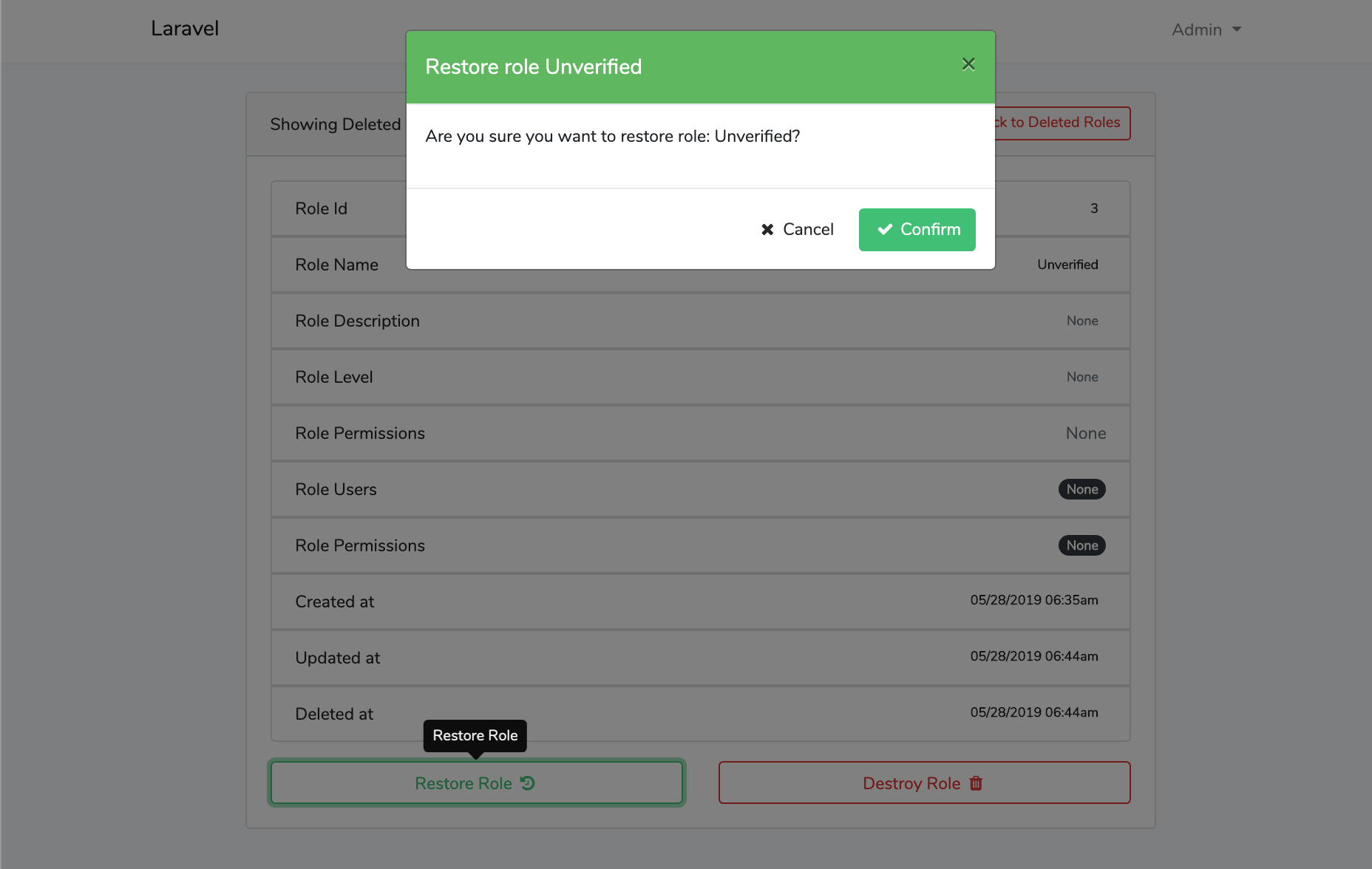 if ($user->hasRole(['admin', 'moderator'])) { /* | Or alternatively: | $user->hasRole('admin, moderator'), $user->hasRole('admin|moderator'), | $user->hasOneRole('admin, moderator'), $user->hasOneRole(['admin', 'moderator']), $user->hasOneRole('admin|moderator') */ // The user has at least one of the roles} if ($user->hasRole(['admin', 'moderator'], true)) { /* | Or alternatively: | $user->hasRole('admin, moderator', true), $user->hasRole('admin|moderator', true), | $user->hasAllRoles('admin, moderator'), $user->hasAllRoles(['admin', 'moderator']), $user->hasAllRoles('admin|moderator') */ // The user has all roles}