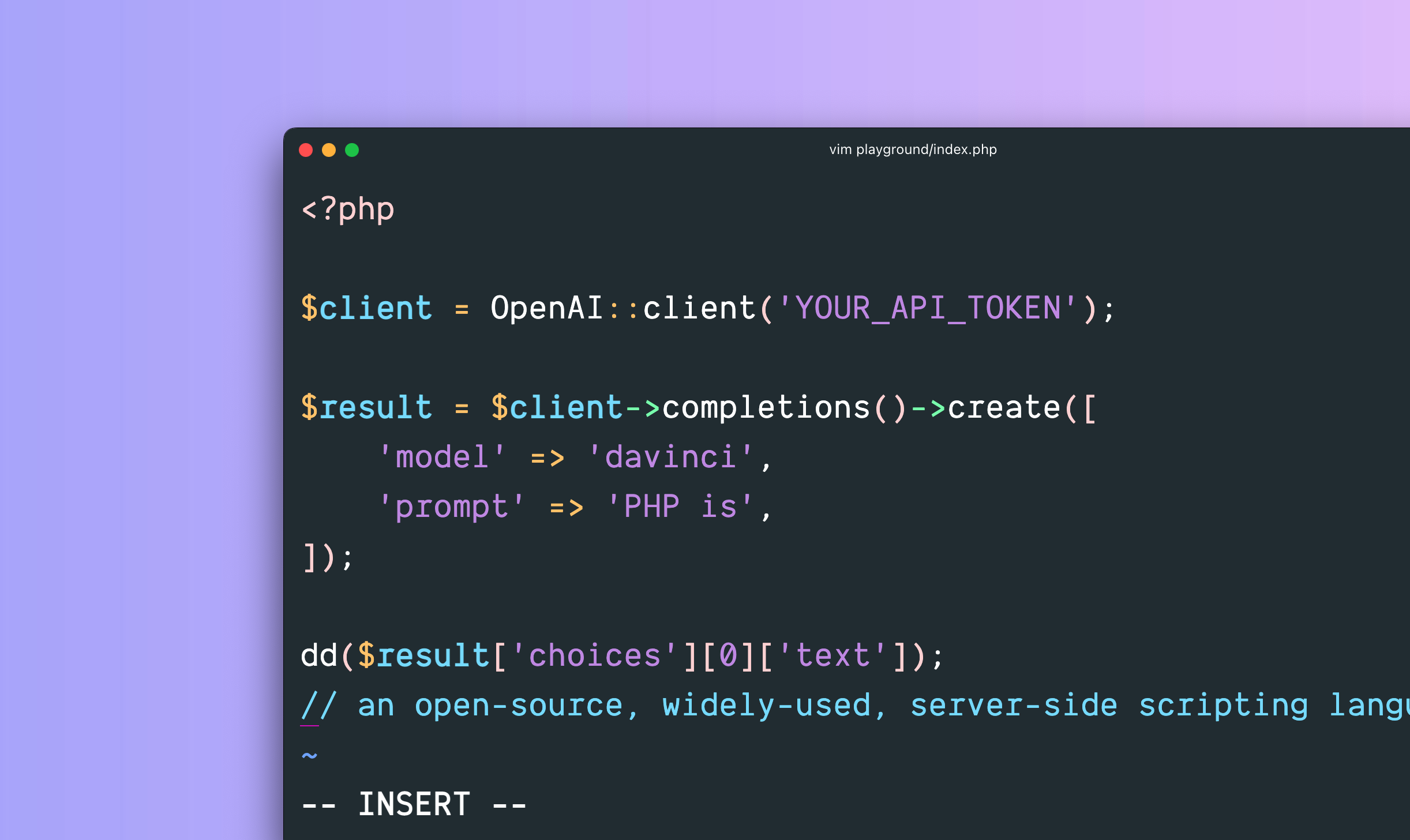 use OpenAI\Laravel\Facades\OpenAI; $result = OpenAI::completions()->create([ 'model' => 'text-davinci-003', 'prompt' => 'PHP is',]); echo $result['choices'][0]['text']; // Outputs AI-generated text