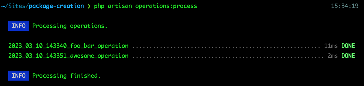 php artisan operations:show // show all operationsphp artisan operations:show pending // show pending operationsphp artisan operations:show processed // show processed operationsphp artisan operations:show disposed // show disposed operations php artisan operations:show pending processed disposed // use multiple filters