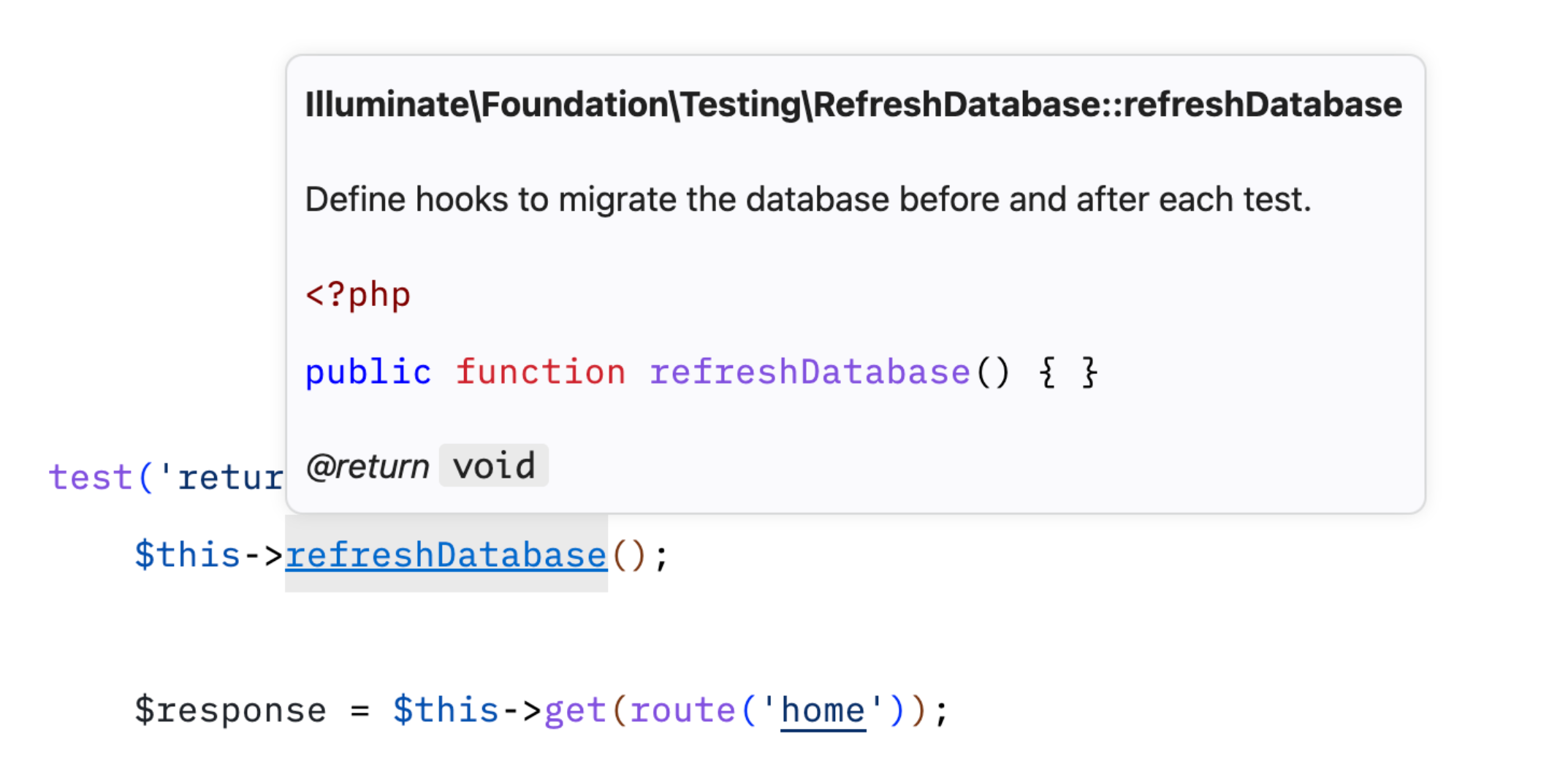 The extension now inspects your project's Pest configuration and generates helper docblocks that preserve the correct $this type inside Pest hooks and tests. It also exposes custom expectation methods, giving you autocomplete for pest()->extend(...), pest()->use(...), and custom expectations.
