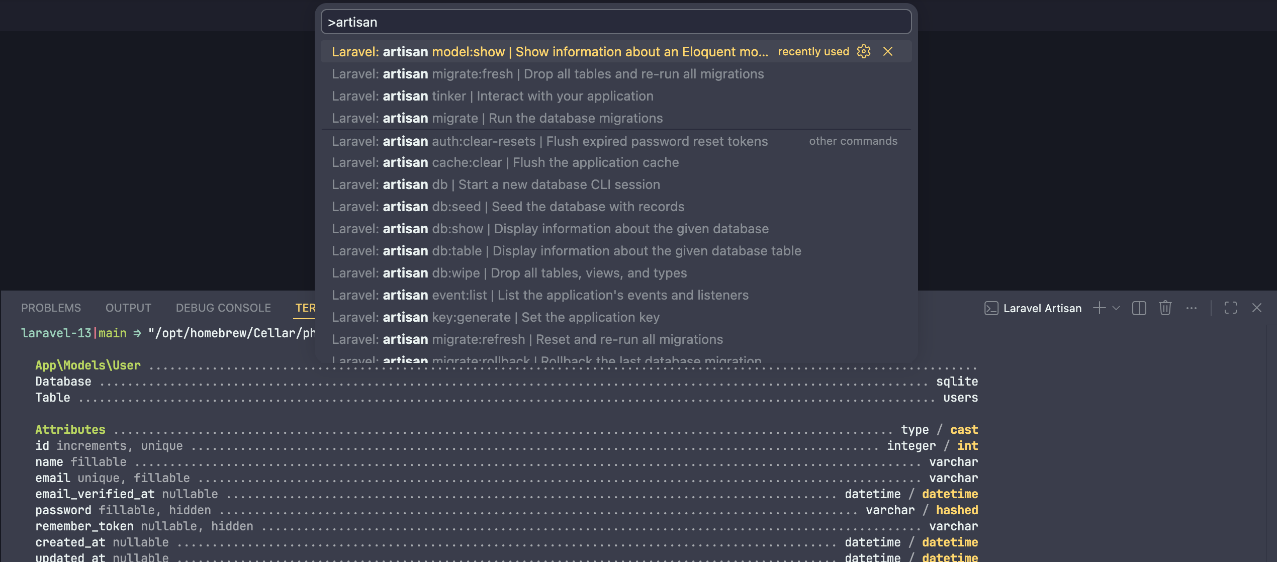 This release adds a curated set of common Artisan commands to the command palette with terminal-based execution. Commands run in a dedicated "Laravel Artisan" terminal so you can see output directly in VS Code. The list includes commands for migrations, database tools, queue management, caching, tinker, route listing, and more.