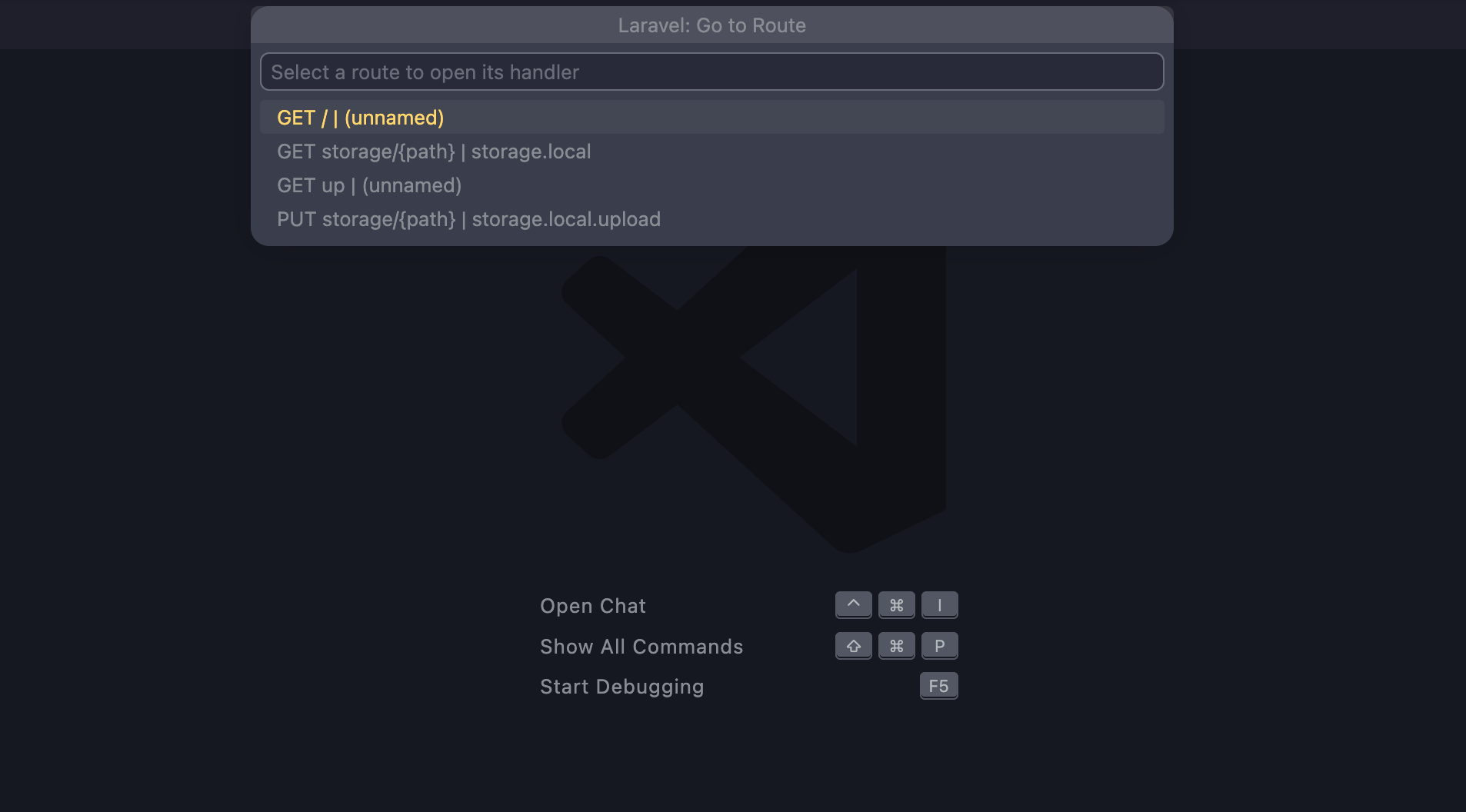 A new command palette action, Laravel: Go to route, opens a picker listing all application routes and navigates directly to the selected route handler. Routes can be searched by path or name.