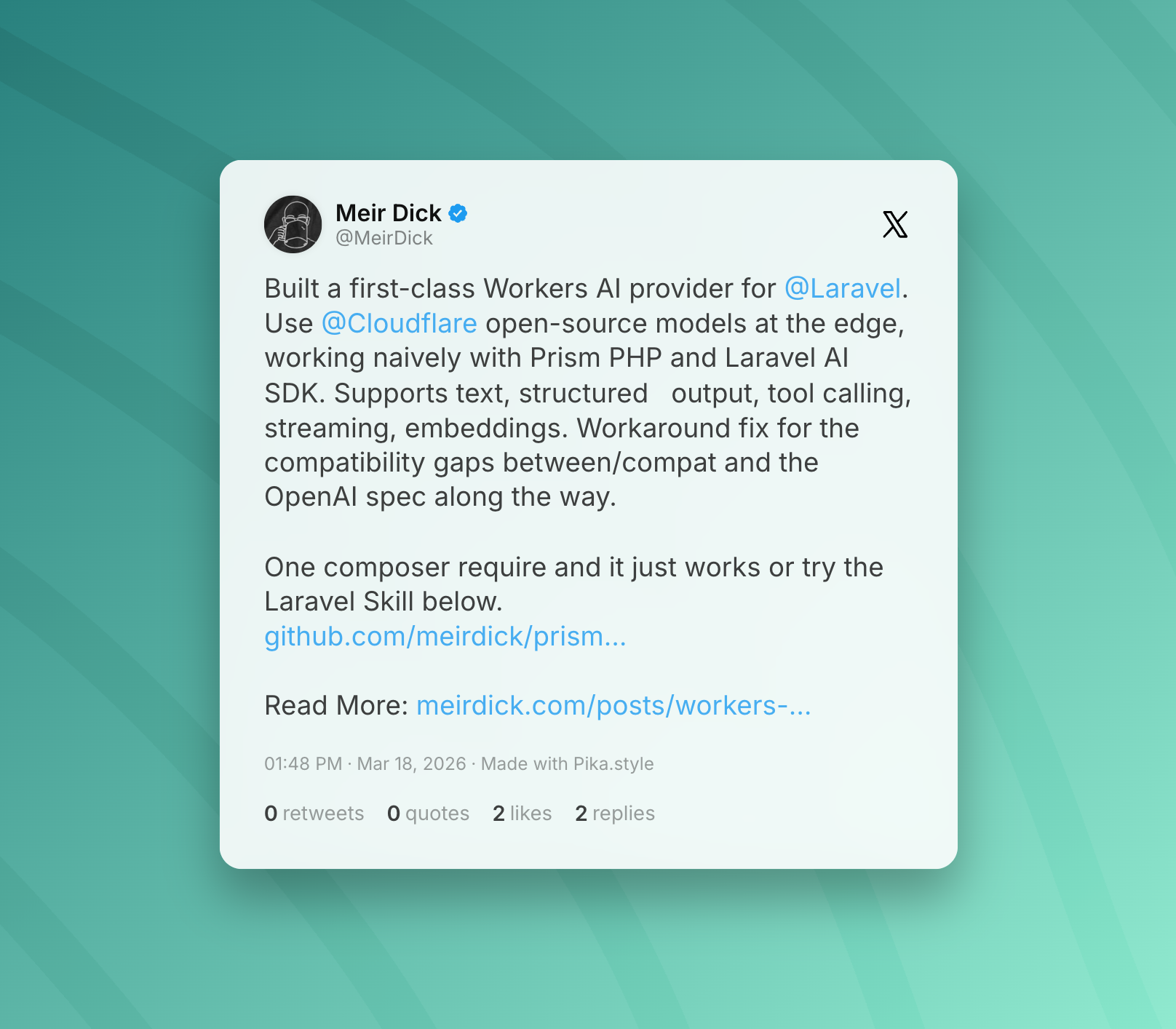 Prism Workers AI is a Cloudflare Workers AI provider for Prism PHP and the Laravel AI SDK. It routes requests through Cloudflare's AI Gateway /compat endpoint.